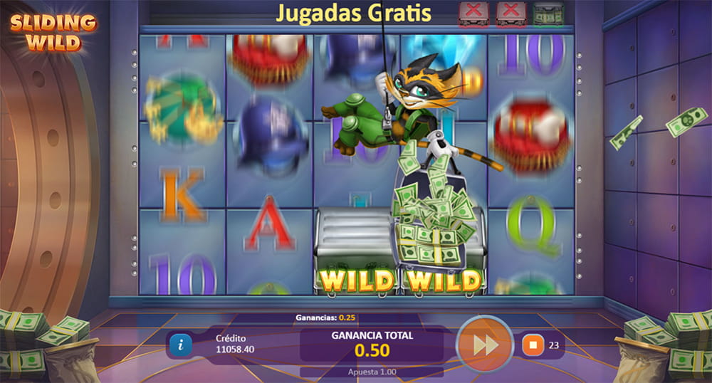 La combinación de dos scatters normales y uno especial da la entrada a las tiradas gratis, el símbolo de distribución especial determina el tipo de partidas gratis que jugarás. El gato con billetes en las patas proporciona giros gratis con hasta 3 wilds deslizantes, los cuales aparecen aleatoriamente en las celdas y bajan una posición con cada jugada. Los comodines especiales reemplazan los demás símbolos y pagan como uno normal, la ronda se termina cuando todos los iconos wild lleguen hasta la parte inferior de los rodillos.