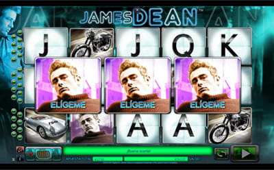 La tragaperras James Dean tiene casi la misma carisma que su protagonista: el actor americano mítico de los años 50 del siglo 20 cuando la gente soñaba cada vez que se iba a ver una película de cine y todos los actores y actrices fueron unas verdaderas estrellas en todo el mundo. Con esta tragaperras te transportas hasta esta época del tiempo y recibes tus premios debajo de una lluvia de diamantes y una música de rock and roll. La tragaperras lo tiene casi todo: giros gratis, juego de riesgo, función bonus y mucho encanto de las fotos de James Dean que nos acompañan en todas las funciones especiales.