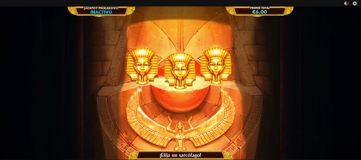 Cada elección te otorga un premio en metálico, pero puede contener uno de los siguientes símbolos: una llave que activa otra tumba secreta con premios, una llave que abre la cámara con el sarcófago donde puedes ganar el jackpot y la tercera opción es cobrar, dando por concluida la función. Los 15 giros gratis de la slot se conceden en la segunda función: La Maldición de los Antiguos. En esta función lo interesante es que durante las tiradas gratis después de cada giro desaparecen símbolos y así aumentan las probabilidades de ganar premios. Si aparece el símbolo de la llave de la cámara del sarcófago se activa el minijuego donde debes elegir entre tres sarcófagos. Uno de ellos tiene el jackpot progresivo y los otros dos te pueden conceder premios en metálico.