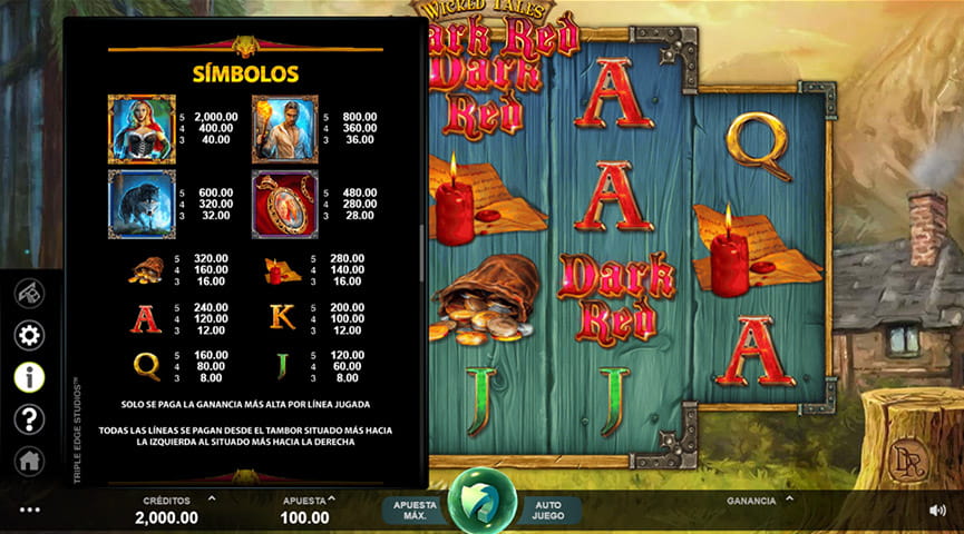 Wicked Tales: Dark Red es una tragaperras muy entretenida con una temática basada en la película de cine de EE.UU: Caperucita Roja: ¿a quién tienes miedo?. Como indica el nombre, la slot tiene como base el tema del cuento infantil. Los símbolos de la slot son los dibujos de los protagonistas de la película, quedando reflejada la alta calidad del juego en cuanto a gráficos, sonido y funciones especiales. La slot fue creada por la empresa Triple Edge Studios para el gigante Microgaming, por lo cual podemos estar seguros de que esta slot merece la pena jugarla muchísimas veces sin que nos aburramos.